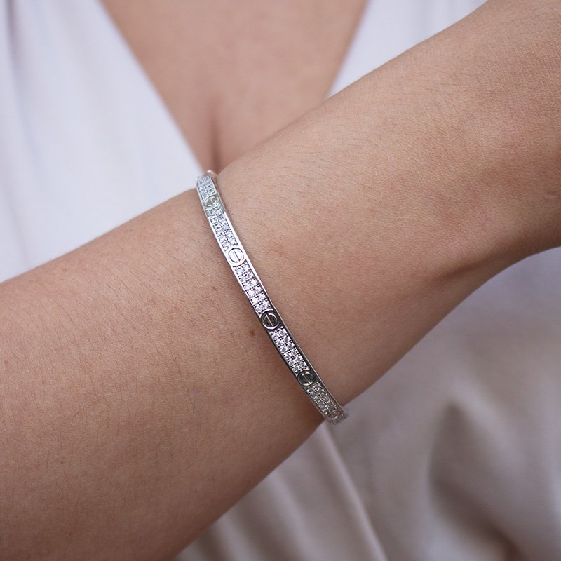 Pulseira rígida prateada com acabamento em zircônias e textura geométrica sutil. O design fino e moderno traz sofisticação e leveza ao visual. Ideal para quem busca elegância com um toque contemporâneo.