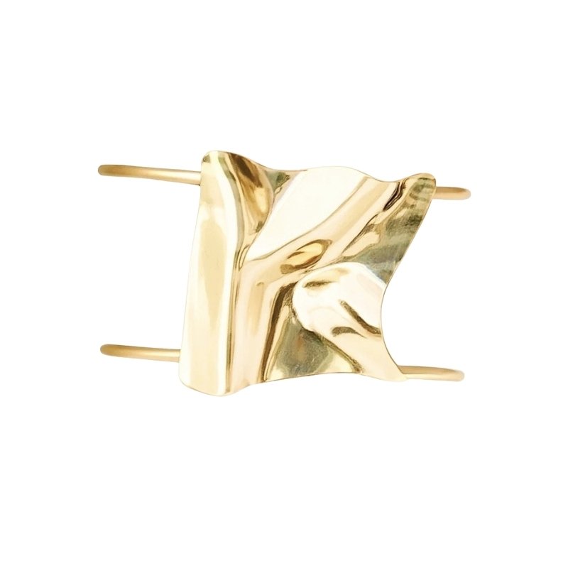 Bracelete dourado com estrutura dupla e placa central de design orgânico e escultural. A superfície polida reflete a luz com sofisticação, destacando as curvas fluidas da peça. Ideal para compor looks impactantes com elegância e originalidade.