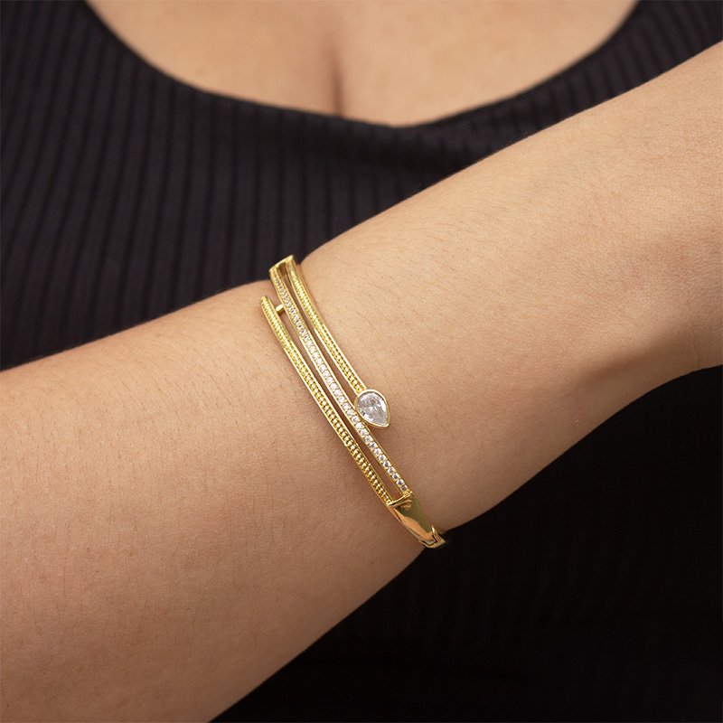 Pulseira rígida dourada com dupla estrutura e detalhe de gota cravejada no centro. Moderna e sofisticada, combina linhas minimalistas com o brilho delicado da zircônia.