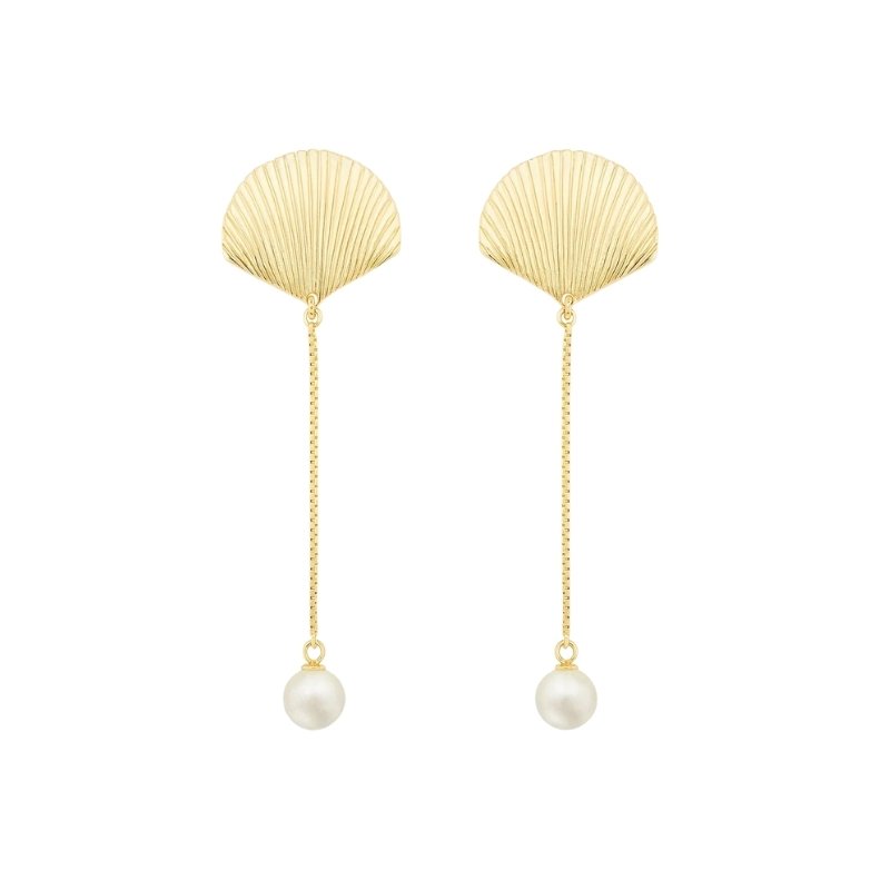 Brincos concha dourada com corrente fina e pérola pendente.