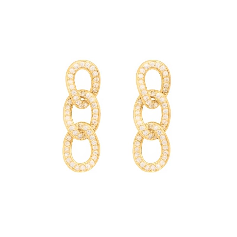 Brinco dourado com três elos ovais entrelaçados, todos cravejados com zircônias brilhantes. O design elegante e moderno garante destaque e luminosidade ao visual. Ideal para quem busca sofisticação com toque contemporâneo.