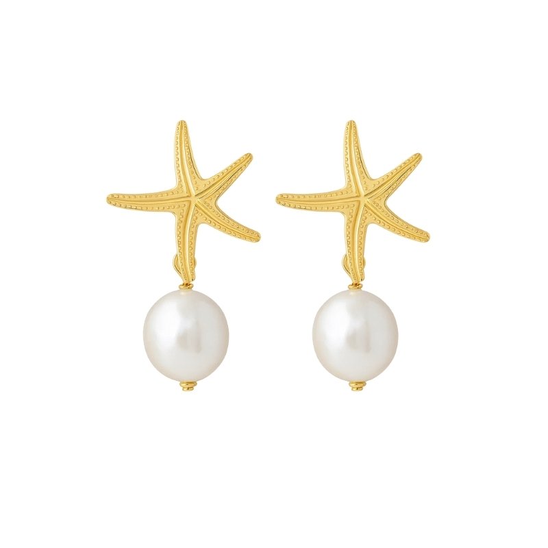Brincos dourados estrela-do-mar com pérola pendente.