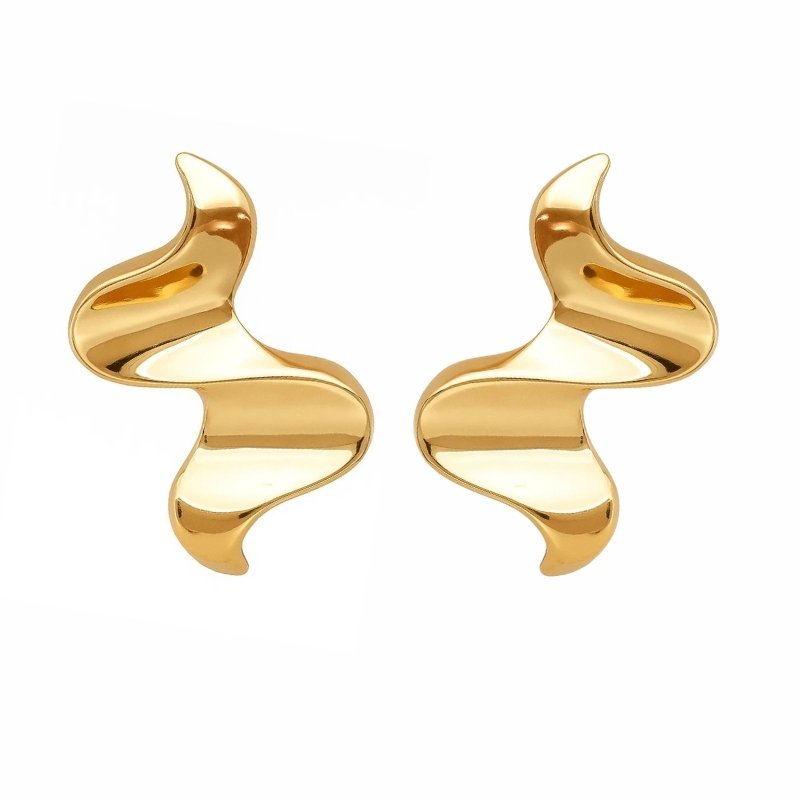 Brinco com design ondulado e acabamento espelhado em dourado. Formato fluido que remete ao movimento das chamas ou ondas.