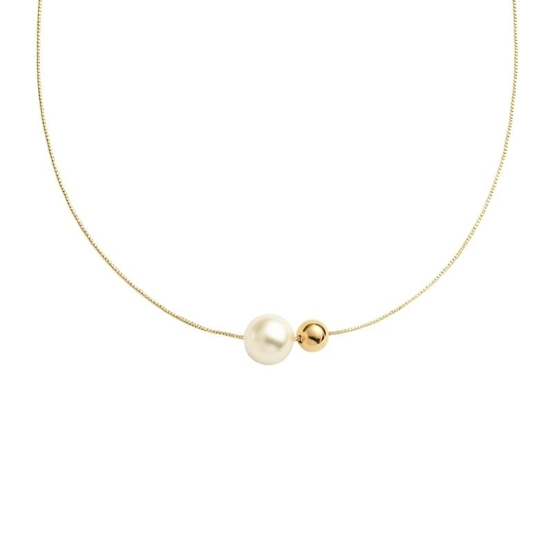 Colar com pérola central e esfera dourada lisa.