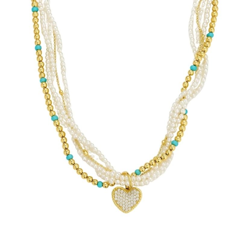 Colar de pérolas dourado com pingente de coração cravejado.