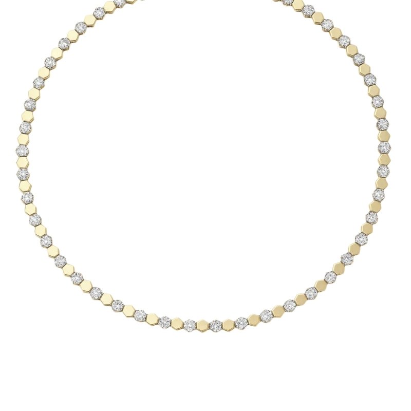 Colar com banho dourado liso e prata cravejado em formato geométrico.
