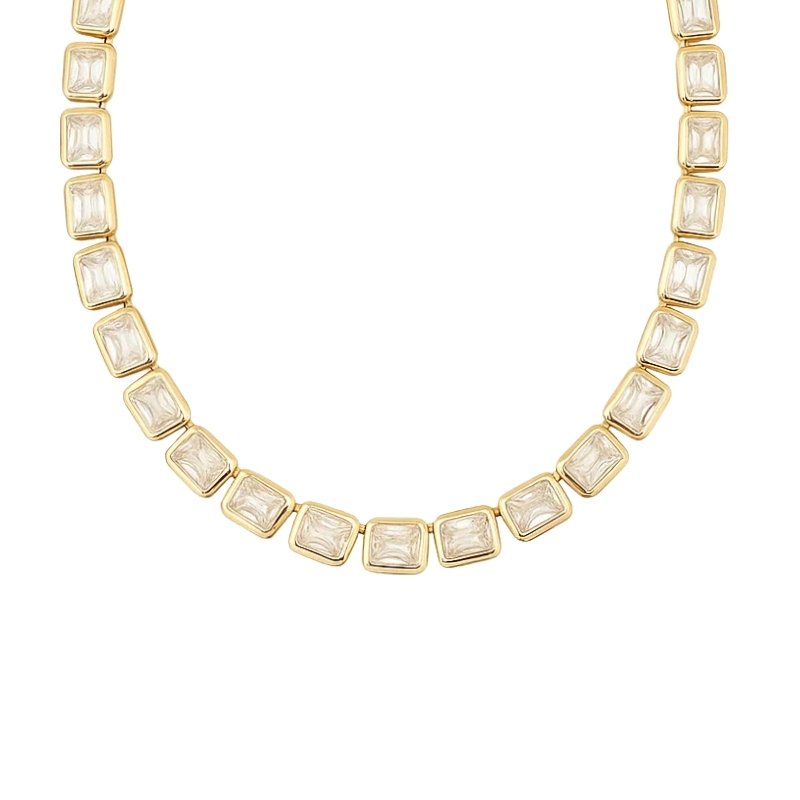 Colar dourado com quadrados facetados e acabamento transparente.
