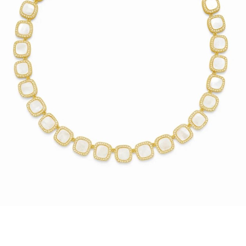 Colar dourado com pedras quadradas em tom madrepérola e bordas cravejadas. Design clássico que valoriza o colo com sofisticação. Perfeito para eventos formais e produções elegantes.
