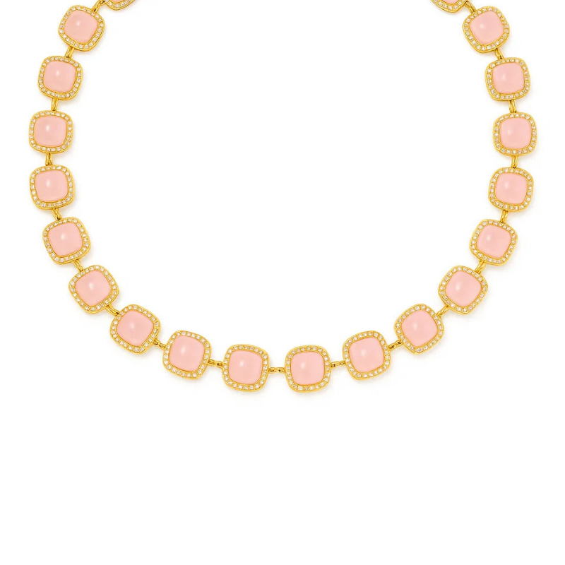Colar dourado com pedras quadradas em rosa e bordas cravejadas. Design clássico que valoriza o colo com sofisticação. Perfeito para eventos formais e produções elegantes.