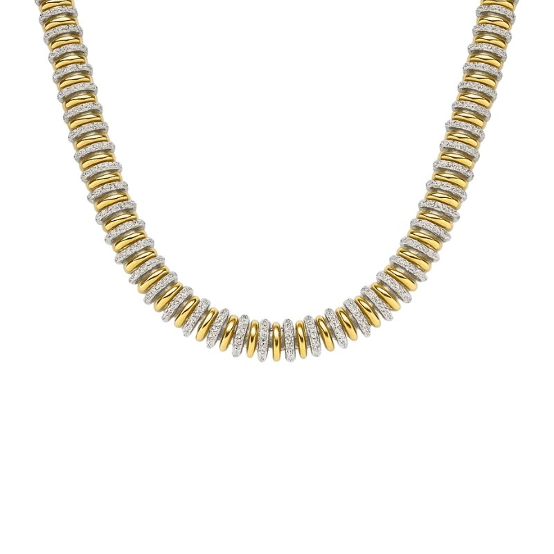 Colar com elos ovais dourados lisos intercalados com elos pratas cravejados.