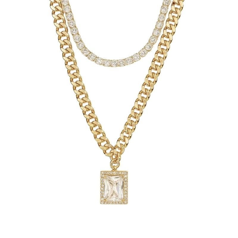Colar dourado duplo com zircônias e pingente retangular.