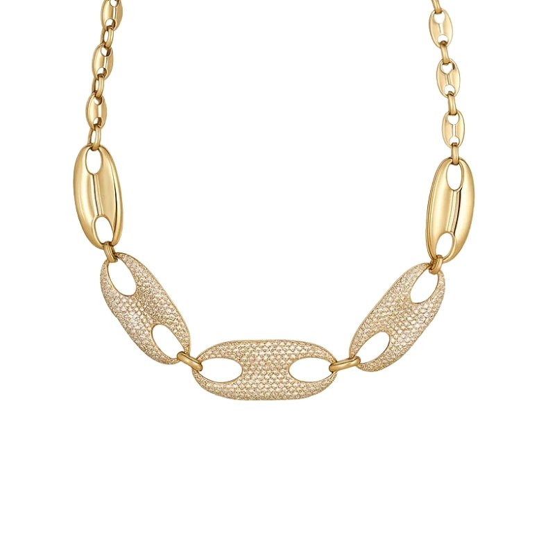 Colar dourado com elos ovais lisos e cravejados.