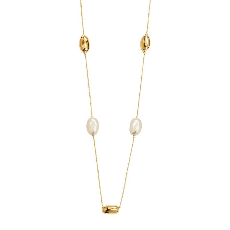 Colar dourado com detalhes de pérolas e formas orgânicas.