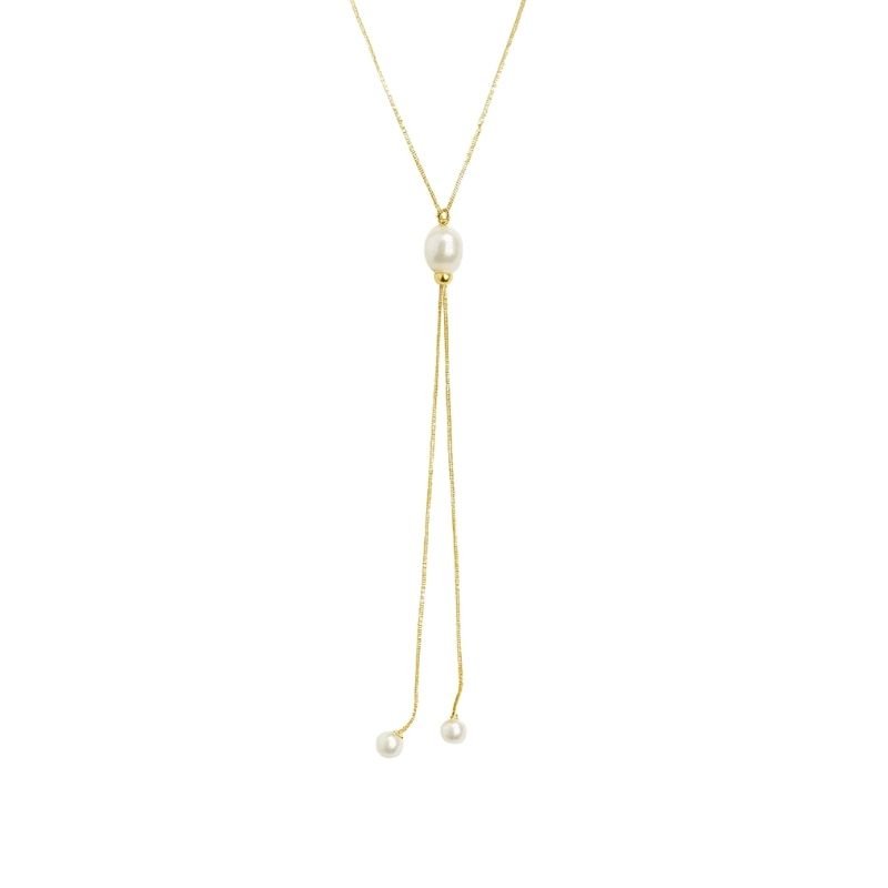 Colar dourado longo com pérolas na ponta.