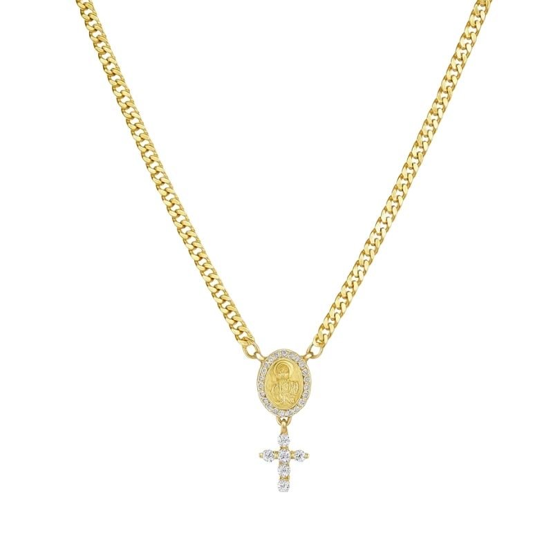 Colar religioso dourado com medalha e cruz cravejada.