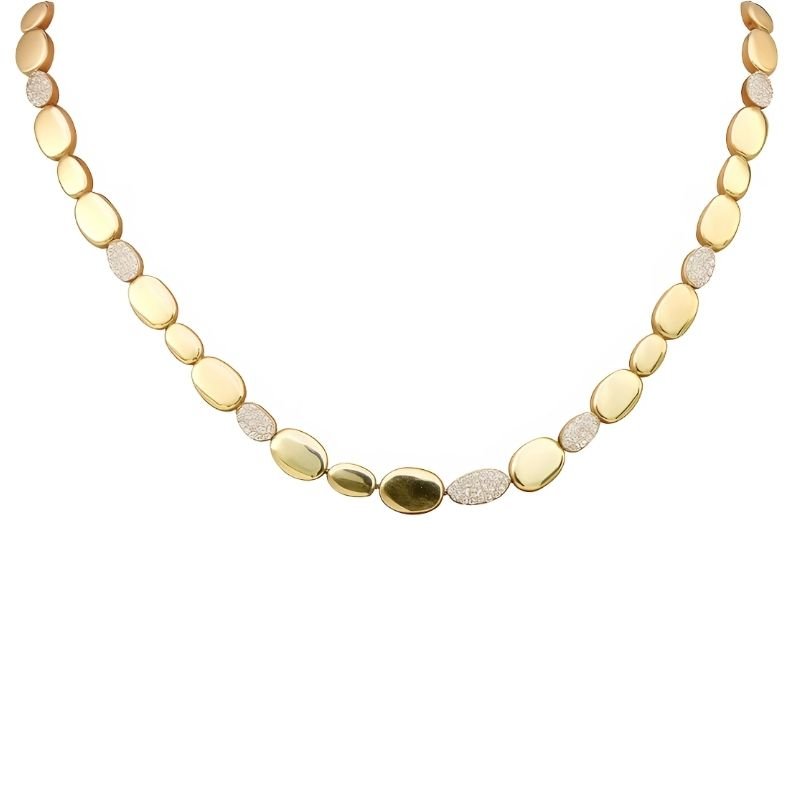 Colar com elos ovais dourados intercalados com elos cravejados, formando um design sofisticado. A combinação de brilho e textura cria um visual elegante e moderno. Ideal para ocasiões especiais ou para dar destaque a produções refinadas.
