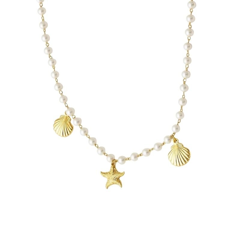 Colar com pérolas e pingentes dourados de estrela e conchas.