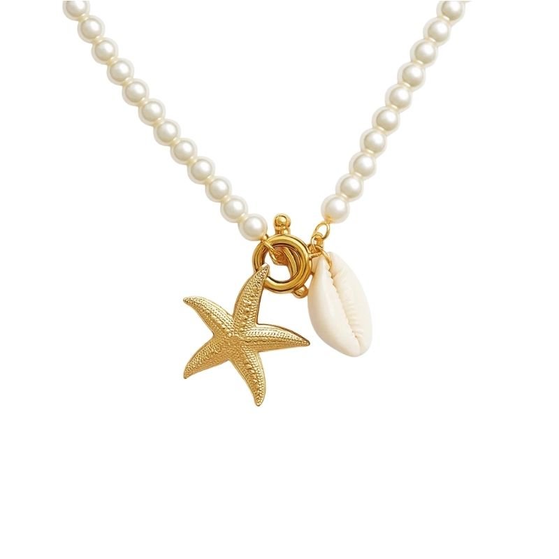 Colar de pérolas com pingentes de estrela-do-mar e búzio.