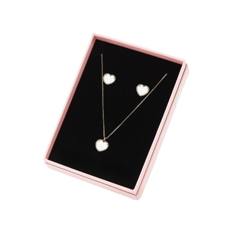 Conjunto composto por colar e par de brincos da linha de semijoias, acompanhada com uma caixa rosa personalizada, ideal para presentear ou para guardar suas peças com carinho.