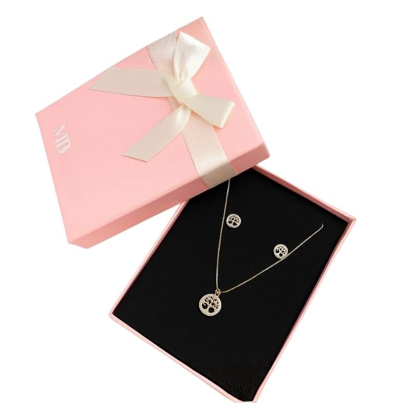 Conjunto composto por colar e par de brincos da linha de semijoias, acompanhada com uma caixa rosa personalizada, ideal para presentear ou para guardar suas peças com carinho.