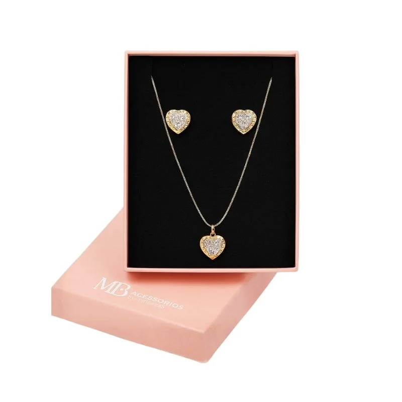Conjunto composto por colar e par de brincos da linha de semijoias, acompanhada com uma caixa rosa personalizada, ideal para presentear ou para guardar suas peças com carinho.