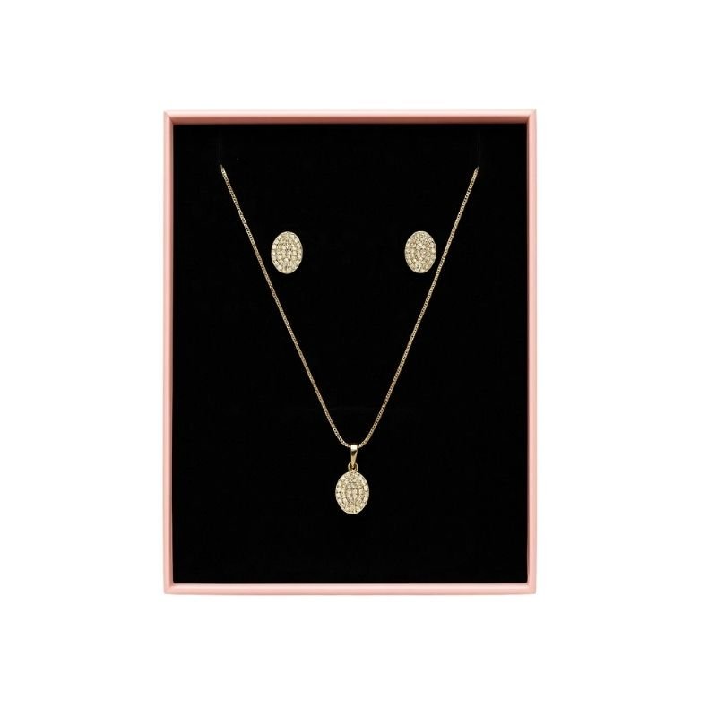 Conjunto composto por colar e par de brincos da linha de semijoias, acompanhada com uma caixa rosa personalizada, ideal para presentear ou para guardar suas peças com carinho.