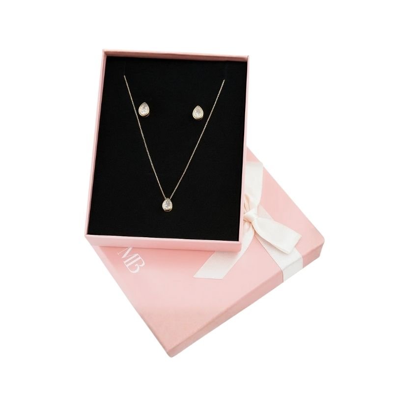 Conjunto composto por colar e par de brincos da linha de semijoias, acompanhada com uma caixa rosa personalizada, ideal para presentear ou para guardar suas peças com carinho.