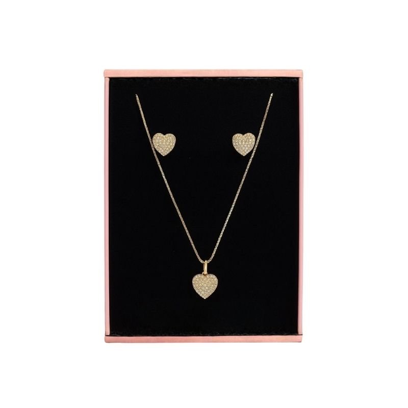Conjunto composto por colar e par de brincos da linha de semijoias, acompanhada com uma caixa rosa personalizada, ideal para presentear ou para guardar suas peças com carinho.