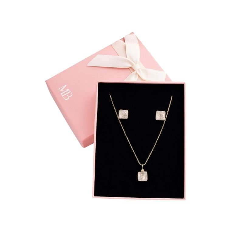 Conjunto composto por colar e par de brincos da linha de semijoias, acompanhada com uma caixa rosa personalizada, ideal para presentear ou para guardar suas peças com carinho.