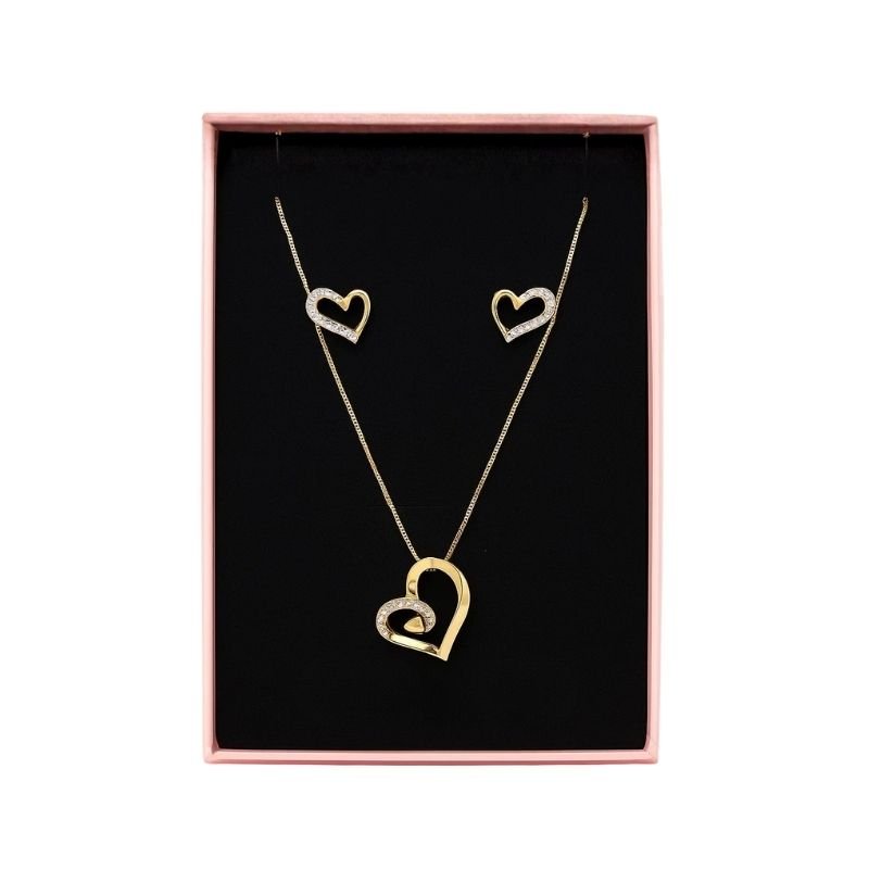 Conjunto composto por colar e par de brincos produzidos em semijoia, acompanhada com uma caixa rosa personalizada de cortesia, ideal para presentear ou para guardar suas peças com carinho.