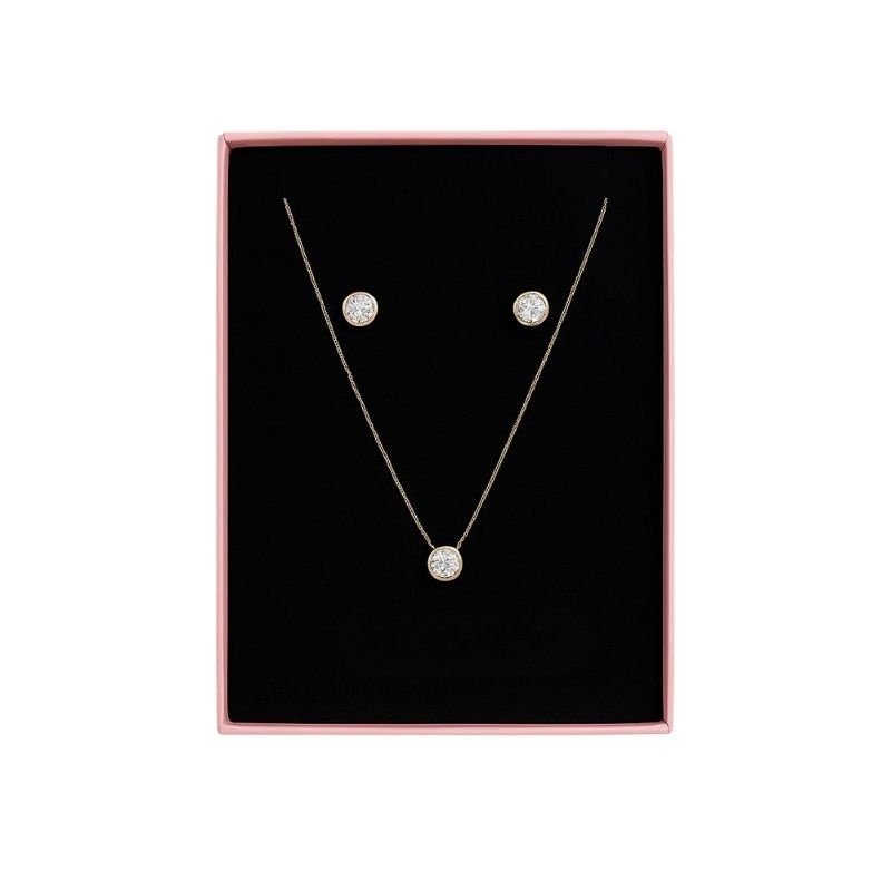 Conjunto composto por colar e par de brincos da linha de semijoias, acompanhada com uma caixa rosa personalizada, ideal para presentear ou para guardar suas peças com carinho.