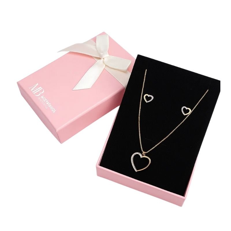 Conjunto composto por colar e par de brincos da linha de semijoias, acompanhada com uma caixa rosa personalizada, ideal para presentear ou para guardar suas peças com carinho.