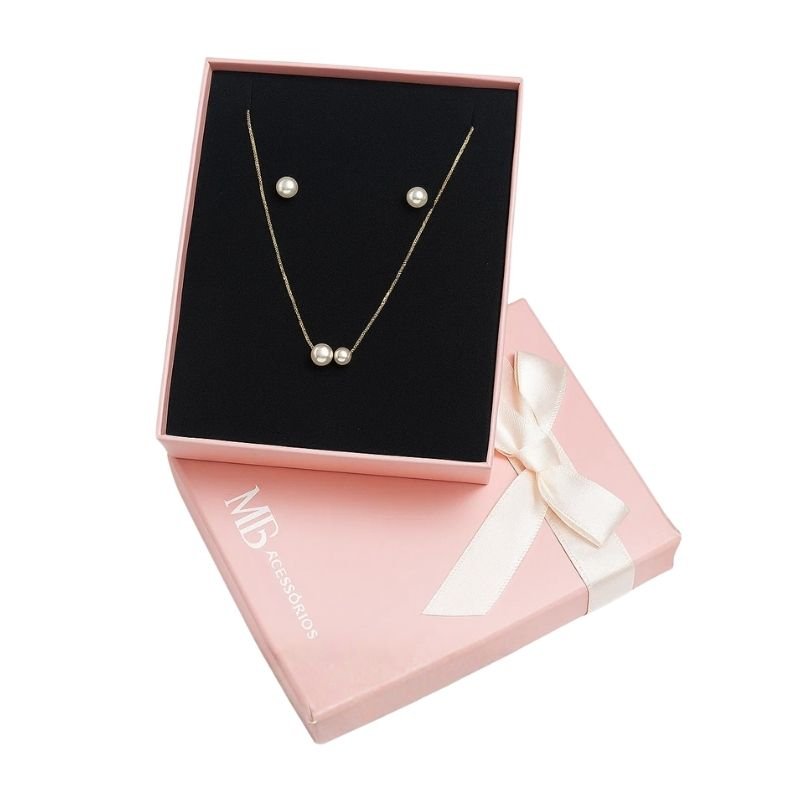 Conjunto composto por colar e par de brincos da linha de semijoias, acompanhada com uma caixa rosa personalizada, ideal para presentear ou para guardar suas peças com carinho.