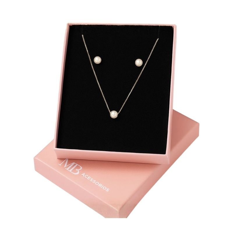 Conjunto composto por colar e par de brincos da linha de semijoias, acompanhada com uma caixa rosa personalizada, ideal para presentear ou para guardar suas peças com carinho.