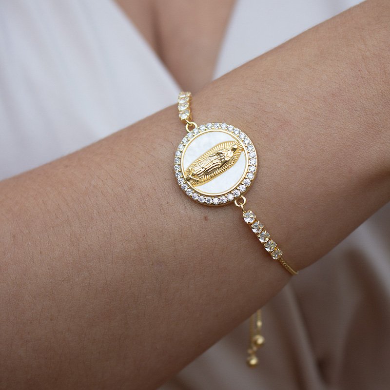 Pulseira ajustável com coração em madrepérola e Nossa Senhora em relevo, cercada por zircônias brilhantes. Um acessório que une delicadeza, fé e sofisticação no mesmo detalhe.