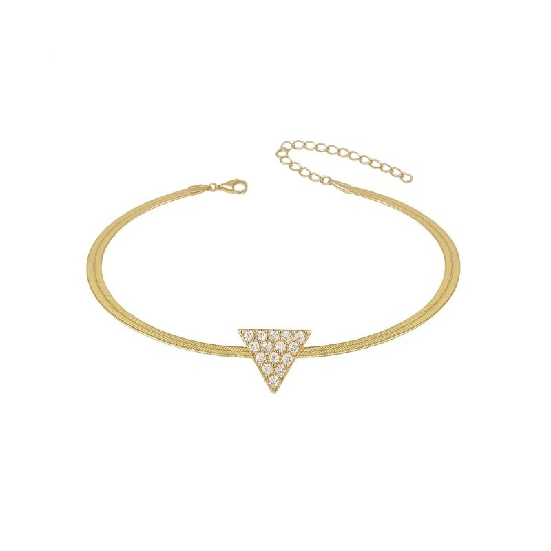 Colar dourado com malha fina e pingente triangular cravejado de micro zircônias. Design delicado e moderno, perfeito para realçar o colo, versátil para composições elegantes e sofisticadas.